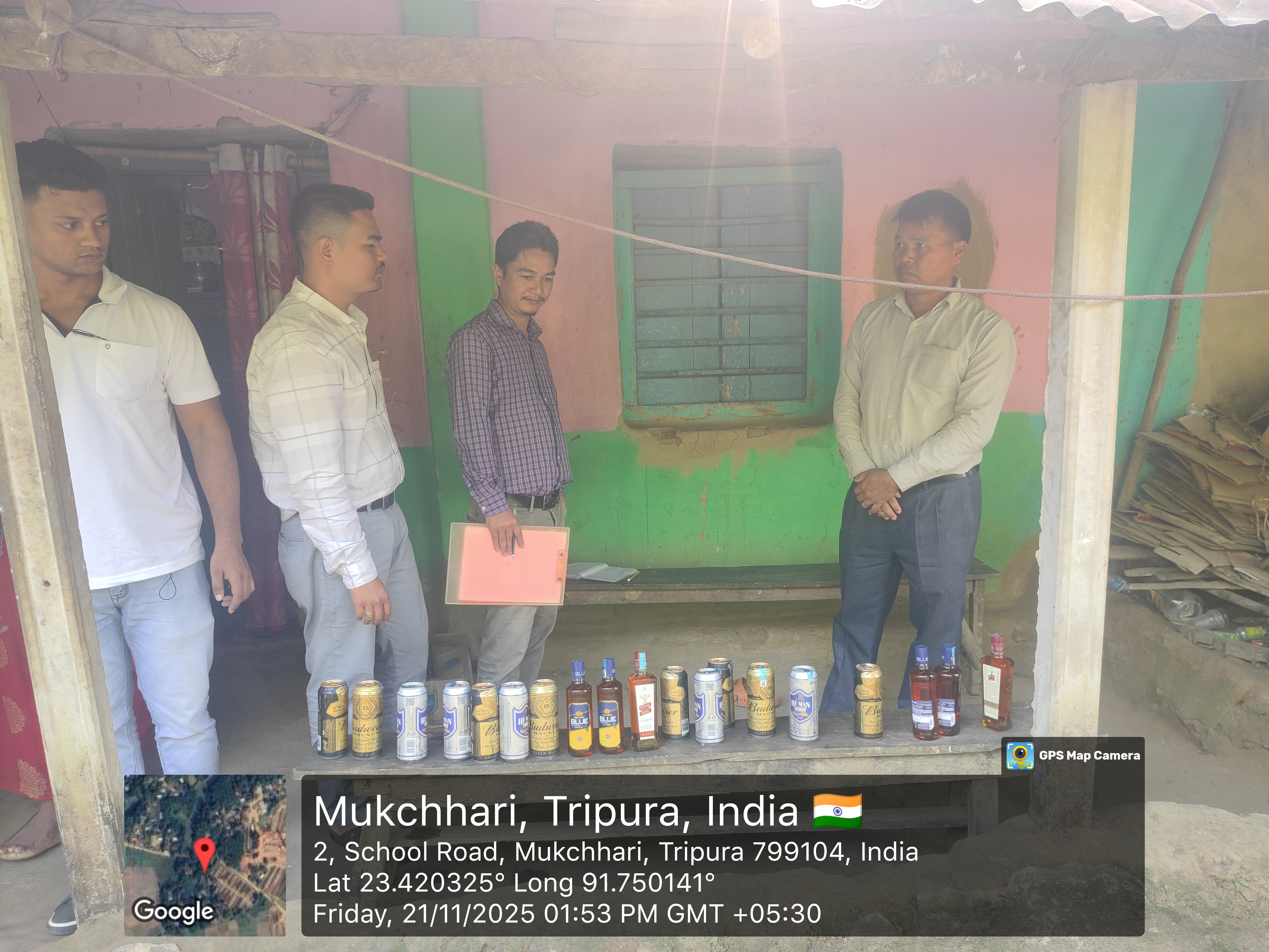 On the basis of secret information of our excise Guards, Excise preventive staffs under Gomati District have conducted anti liquor raids in Jatanbari Mukchhari, Amarpur bazar & Natun bazar area at under Amarpur & Korbook Sub-Division in Gomati District on 21/11/2025 at about 11ᛆ PM to 04ᚨ PM. In the said anti liquor raids 6.5 BKL of BEER & 2.25 BKL OF IMFL & 05 Liters approx country made liquor.(destroyed on the spot)had been sized by Excise preventive staffs, 01(one) PR will be lodged shortly.